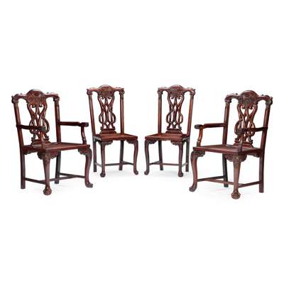 comprising two chairs and a pair of armchairs, the serpentine toprails carved with palmettes, above pierced interlaced splats and solid panelled seats, the arms carved with hand motif, raised on floral carved cabriole front legs ending in claw and ball feet, united by H-stretchers (4)