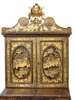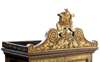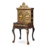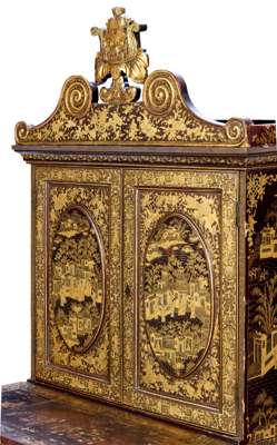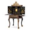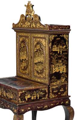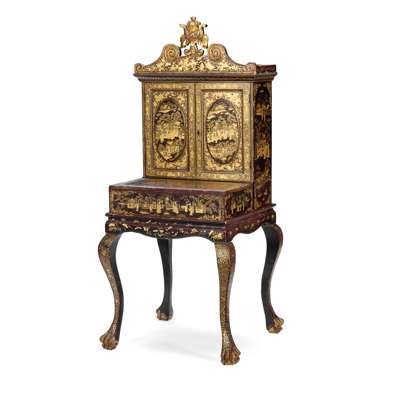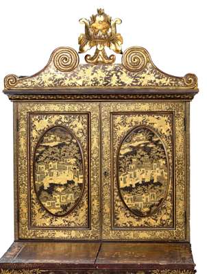 the scrolled pediment centred by a flower motif above a pair of doors opening to an arrangement of drawers and pigeon holes, the base with a removable work box with a bisected hinged top opening to a compartmentalised interior, the stand raised on cabriole legs ending in stylised paw feet; the whole decorated in gilt with garden and terrace landscapes, flowers, insects and courtly figures