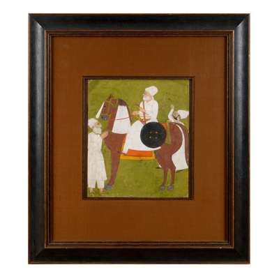 gouache and ink on paper, black border, the raja dressed in white riding a brown stallion to the left, two retainers walking alongside, mounted, glazed and framed