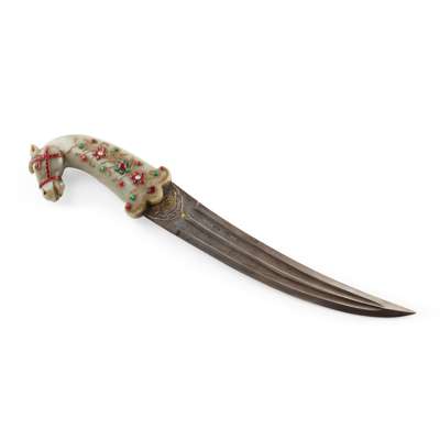 with watered steel blade inlaid with gilt with a scene of a tiger hunting, the carved green hardstone handle in the form of a horse set with gilt metal and pastes in a floral design