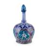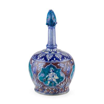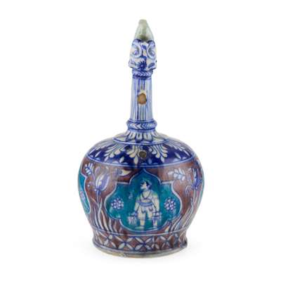 the body of ovoid form with an elongated slender neck, the spout formed as an elephant and animal head, decorated with four barbed panels, each depicting a male figure at work, on an aubergine ground with floral decoration, with further stylised foliate decoration on a blue ground