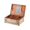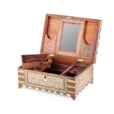 the hinged cover inlaid with scrolling foliate motifs, opening to a compartmented interior with mirror and lift-out tray, the sides with brass banded corners and similar inlay, raised on bracket feet