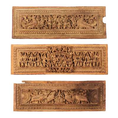 THREE INDIAN CARVED PADOUK WOOD PANELS