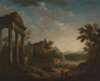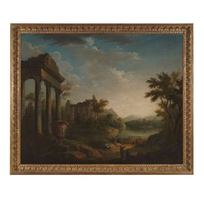 A CLASSICAL LANDSCAPE WITH RUINS AND FIGURES BY A LAKE