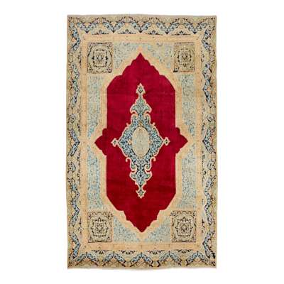 the plain dark red field with blue and cream elongated medallion, similar spandrels, within indigo border
