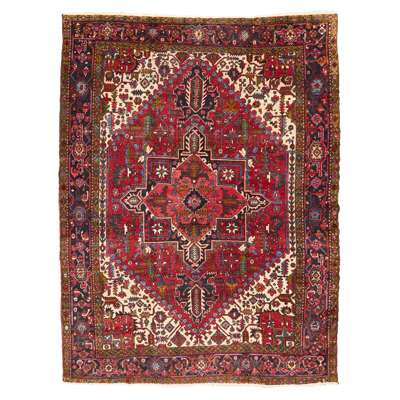 the red field with indigo and red medallion, ivory and red spandrels, within indigo border