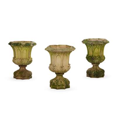 SET OF THREE CAST STONE GOTHIC STYLE GARDEN URNS