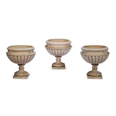 the gadrooned bodies with flower-head bosses to the concave rims, on socle bases with square plinths (3)