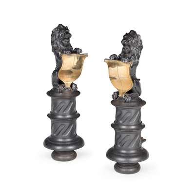 modelled as a pair of rampant lions holding brass shields, surmounting spiral fluted and ring moulded columns (2)