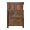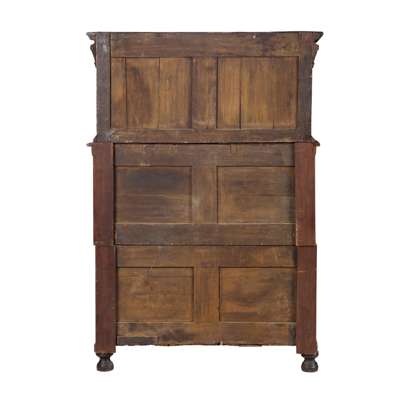 the dentil moulded cornice above a moulded panel long frieze drawer with bracket divides, above a fall front with architectural niches flanking an octagonal moulded panel, all inlaid with mother-of-pearl and bone depicting flowering urns and flower sprays, the panels separated by split-spindle mouldings; the centre part with two geometric moulded long drawers with the same repeated in the lower part, the whole raised on bun feet; initials RH and H to the side