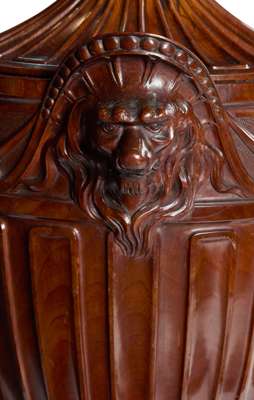 in the Adam style, the fluted covers with slender berry finials above friezes carved with swags, pendants, and bosses flanked by carved lions' mask handles, over tapered reed panel bodies on fluted circular feet and square bases (2)
