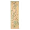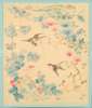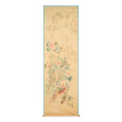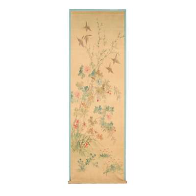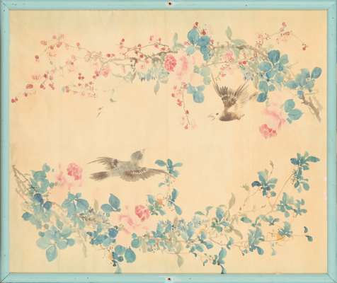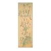 various sizes, all painted with birds and flowering trees, six as single roll panels with scroll ends, three smaller sections, and two larger multi panels scenes, all mounted in green painted frames (11)