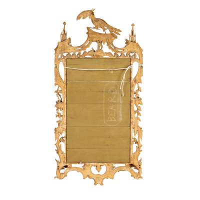 the shaped rectangular mirror plate in an openwork frame with acanthus and C scrolls, surmounted by a large ho-ho bird with rocaille finials to the corners