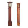 the first with an arched pediment with brass finials above a silvered vernier plate with twin gauges for 'Summer' and 'Winter', signed S. Miles/ Kidderminster, the flat body concealing the tube and cistern, on a plinth; the other with a straight cornice above a paper dial with twin gauges for 'Summer' and 'Winter', signed G. Goodall/ Tadcaster, the line inlaid body with a visible tube above an oval cistern cover with thistle marquetry; both mercury filled (2)