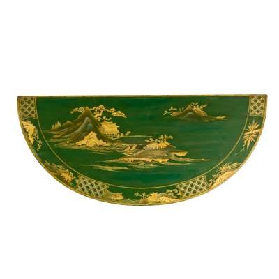 of demi-lune outline, the top decorated in gilt with a chinoiserie scene with mountains, temples, and river views, within a trellis border with landscape reserves, above a reeded frieze marked with flower head blocks, raised on lotus carved fluted tapered legs ending in oval lobed feet