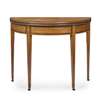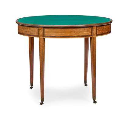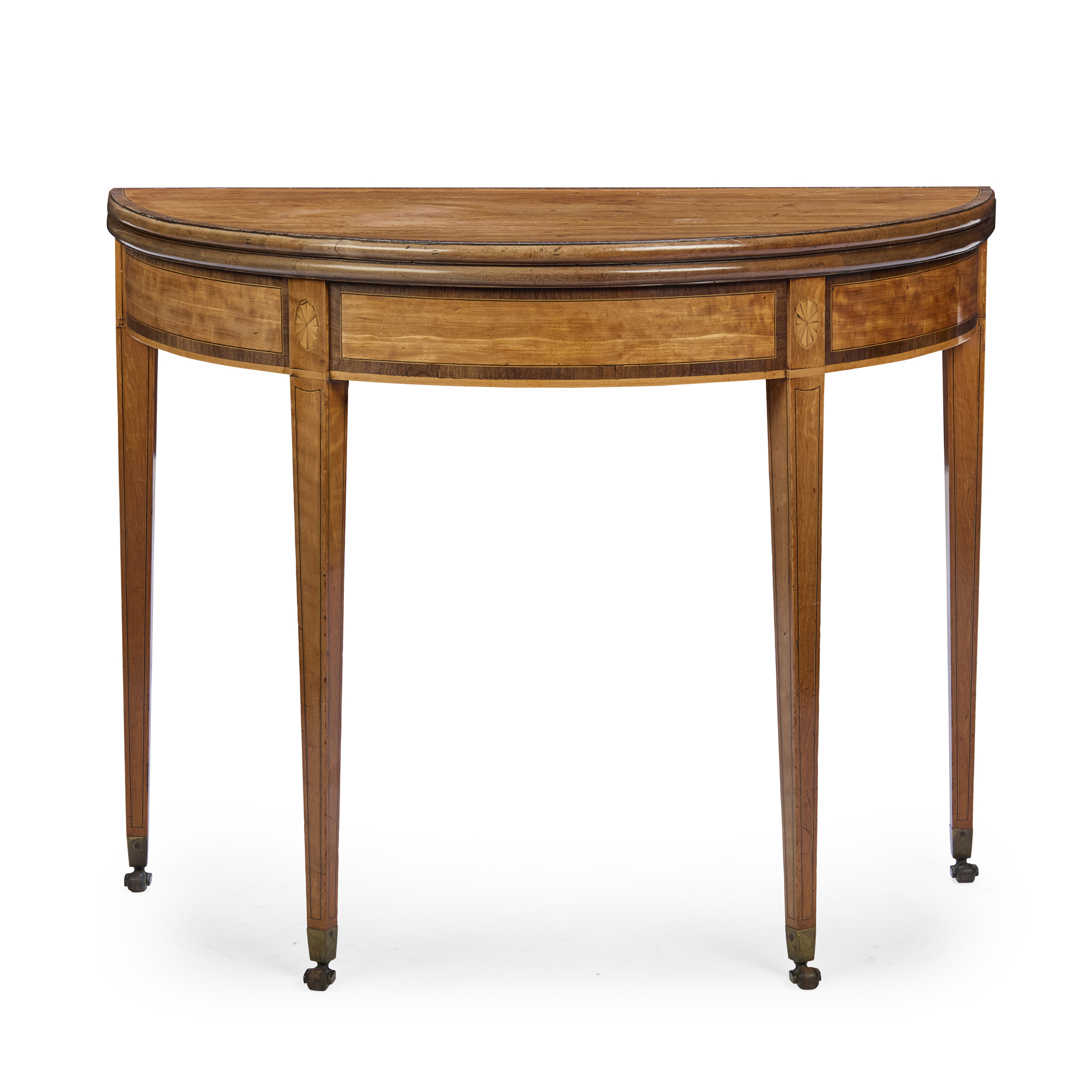 LATE GEORGE III SATINWOOD AND TULIPWOOD DEMI-LUNE GAMES TABLE
