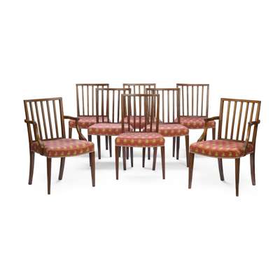 comprising a set of eight with stuff-over seats, including six side chairs and a pair of armchairs; and a similar set of six with drop-in seats pads, including five side chairs and an armchair; all with pineapple print upholstery (14)