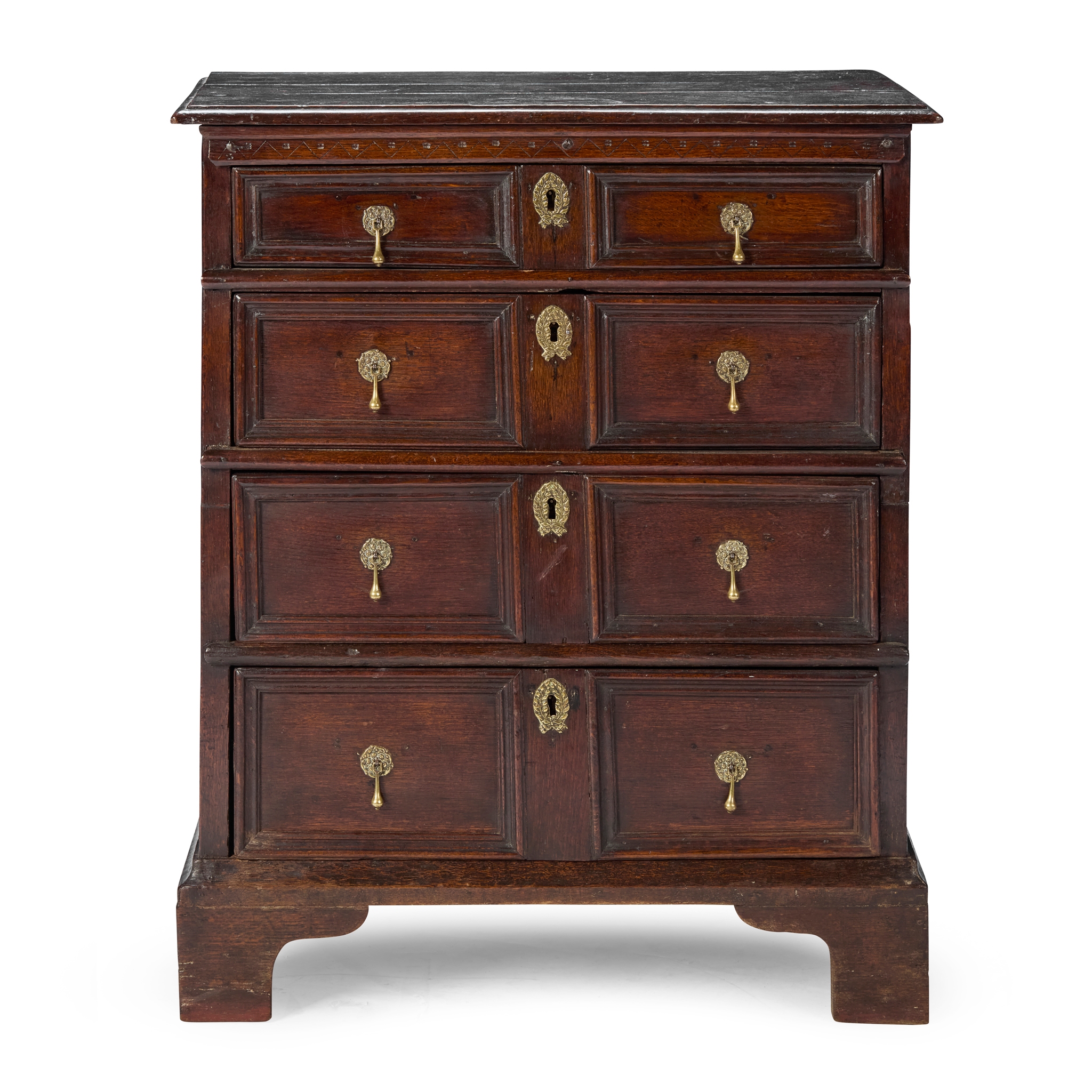 the top with a moulded edge above two short and three long moulded panel drawers, on later bracket feet