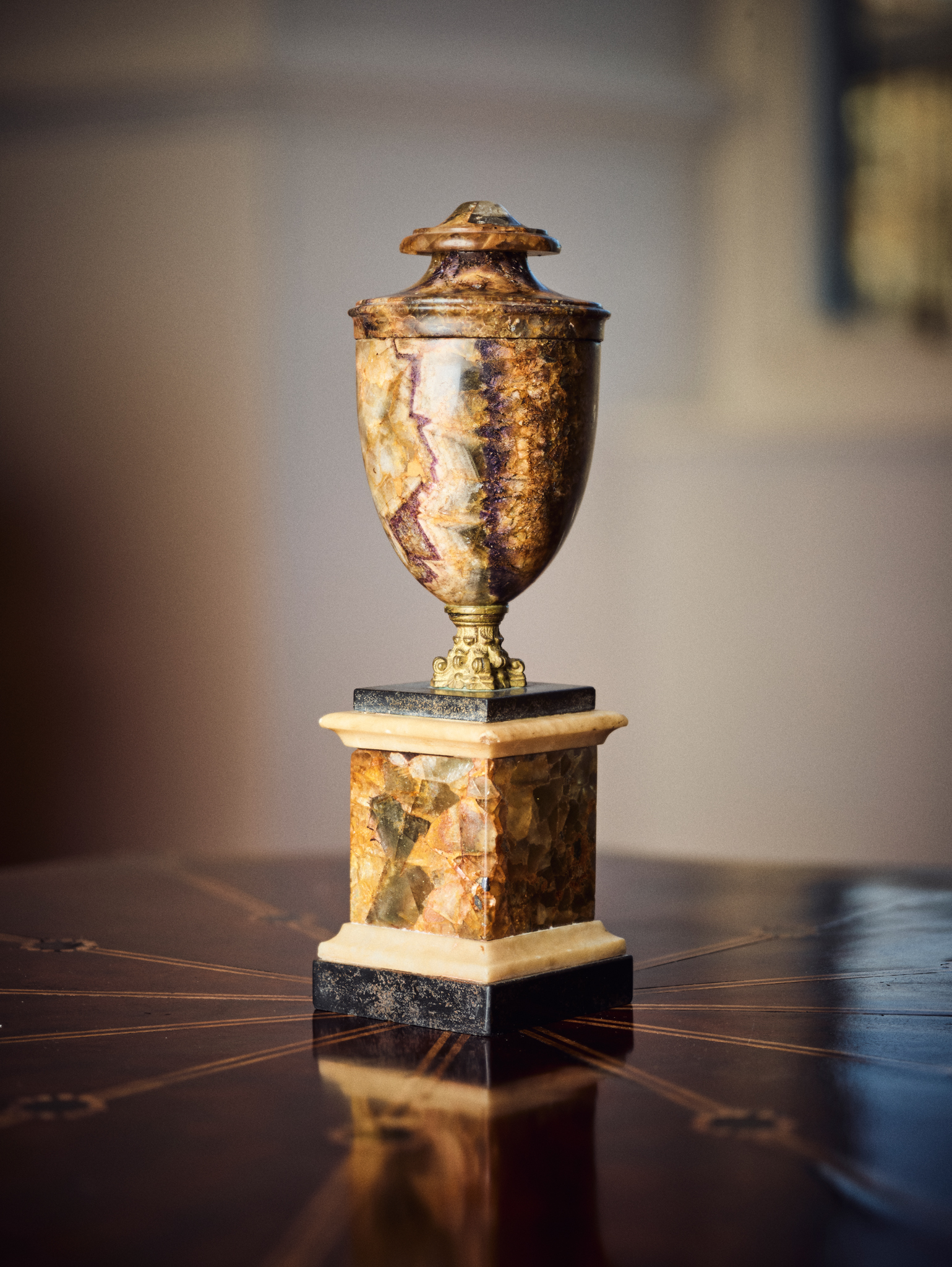 the body on a gilt metal socle formed as a Corinthian capital, raised on a square section plinth base with black and white marble mounts