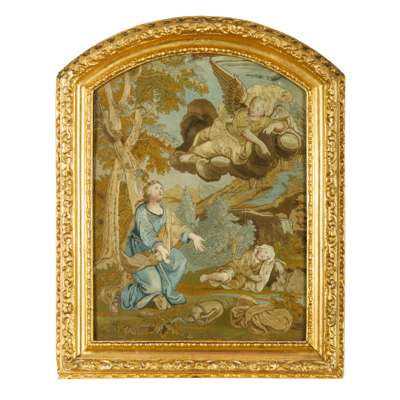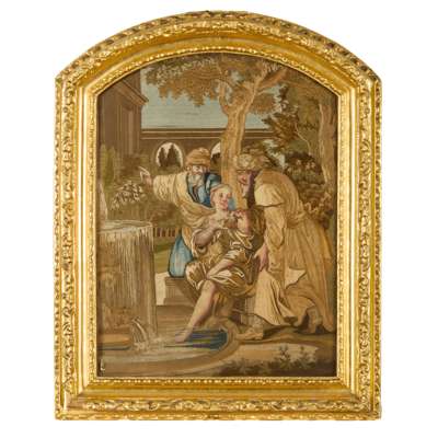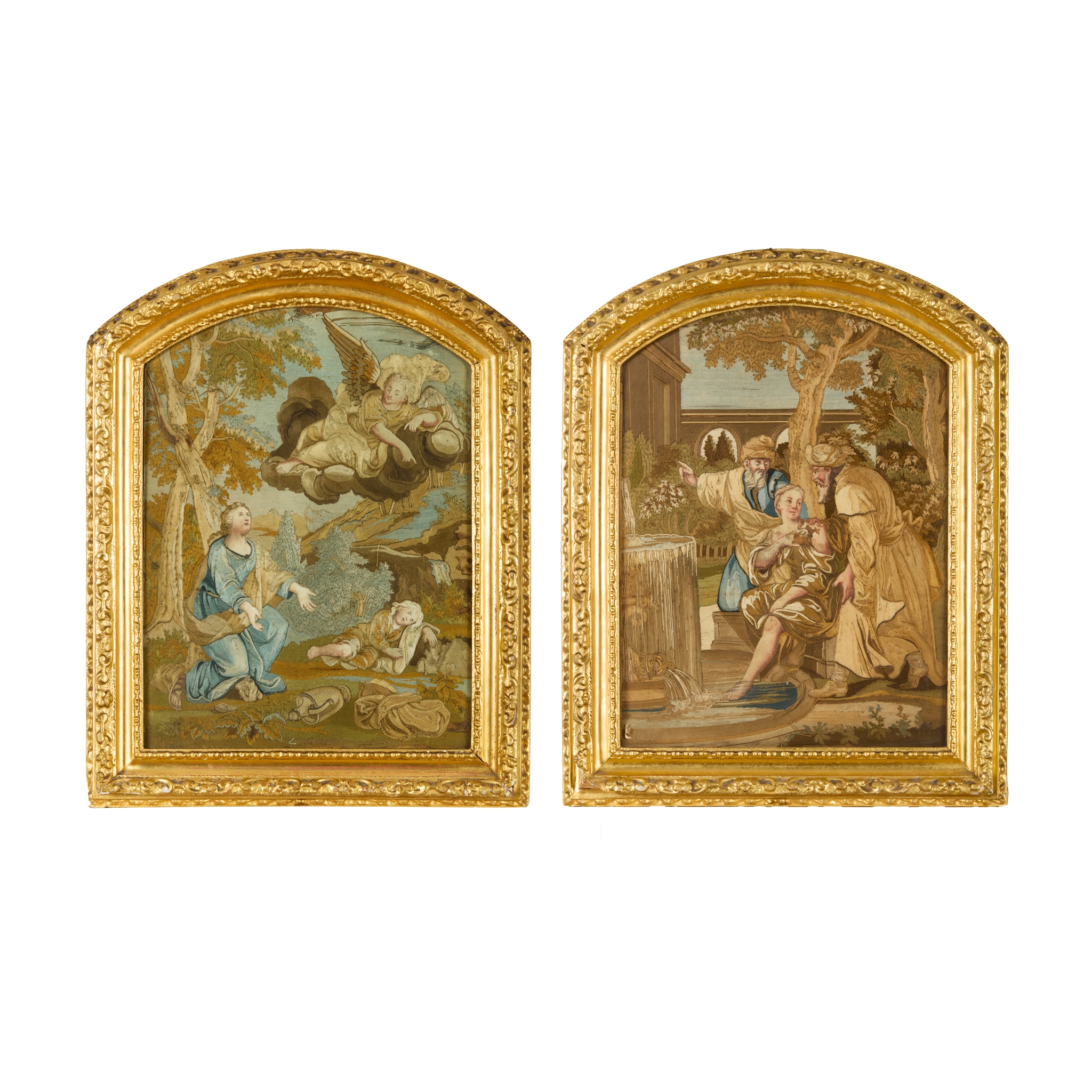 one depicting ‘Hagar and Ishmael in the Wilderness’, the other depicting ‘Susanna and the Elders’, within arched giltwood and gesso frames with a leaf and scroll borders (2)