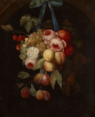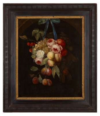 A STILL LIFE OF ASSORTED FRUIT AND FLOWERS IN A NICHE