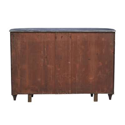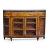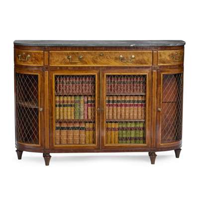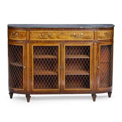the D-shaped dark grey marble top above a central long drawer flanked by short drawers with Bramah locks, over a pair of brass grille lined doors enclosing shelves, flanked by curved side doors to match, raised on tapered feet