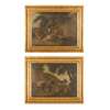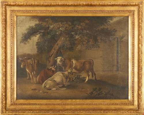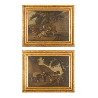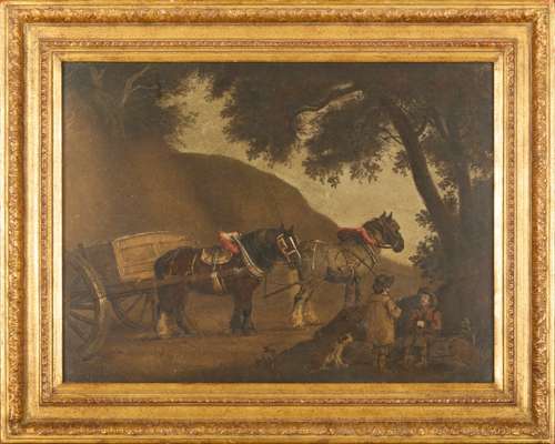 one depicting cows under a leafy tree, the other depicting two cart horses having a rest under a tree with their masters, within later giltwood frames (2)
