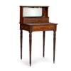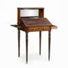 the superstructure with a mirrored back and a pair of short drawers, above a ratchet adjusted writing slope with oxblood leather liner, above a dummy frieze drawer to the front and a real drawer and slide to the opposing side, raised on turned and tapered legs ending in brass caps and castors