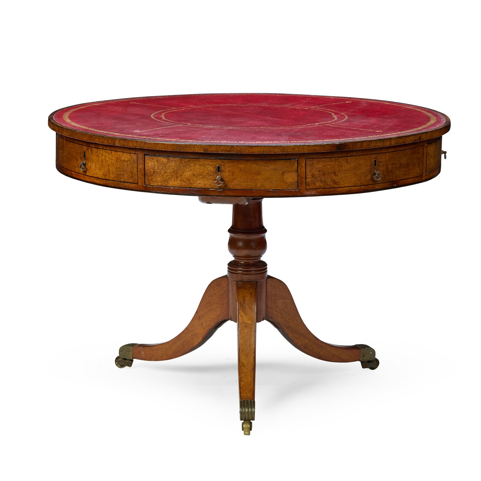 the circular top with a red leather gilt-tooled insert, above four real and four dummy frieze drawers, on a baluster support and four sabre legs, all outlined with ebonised stringing, ending in brass caps and castors