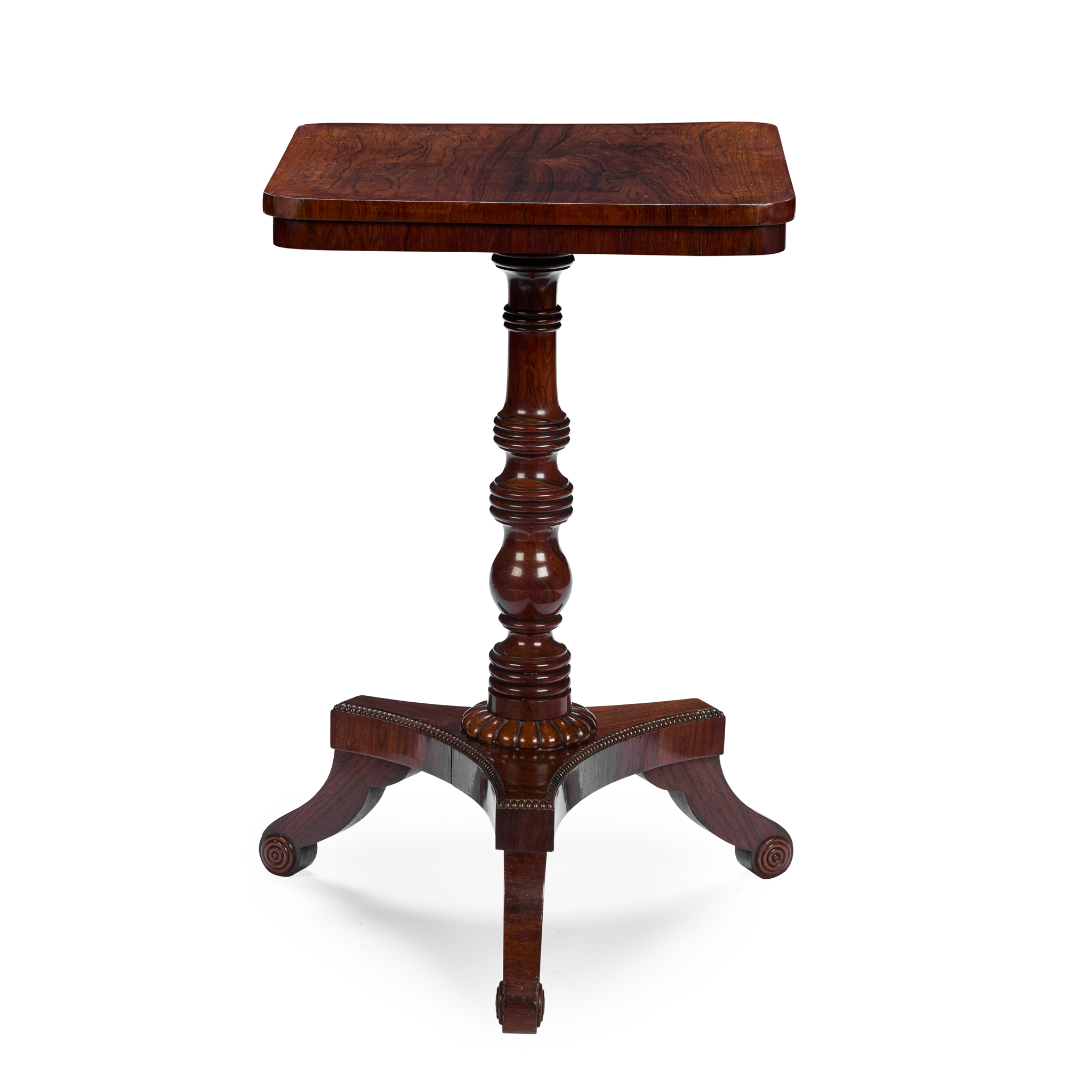 the square top on a ring-turned column and concave triform bead-moulded base raised on scrolled legs