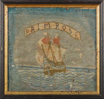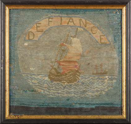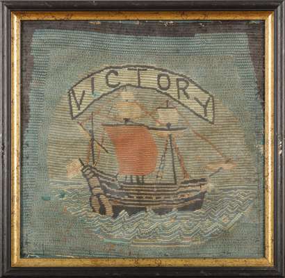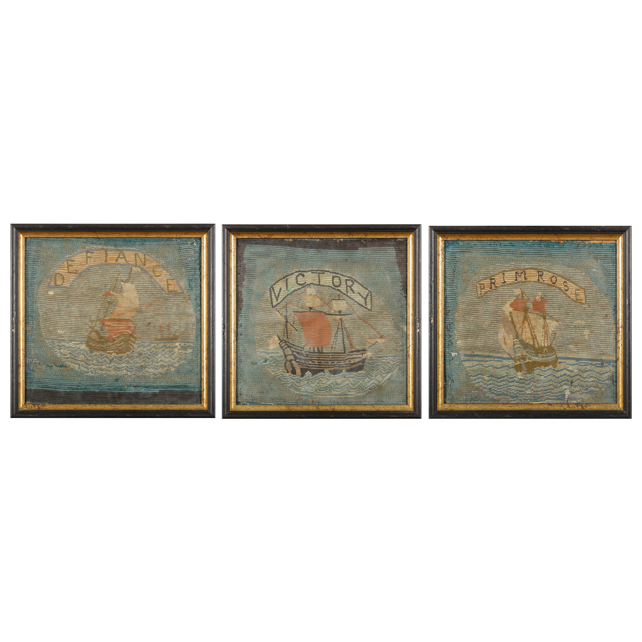 each depicting a battleship in full sail, below banners individually inscribed ‘VICTORY’, ‘DEFIANCE’ and ‘PRIMROSE’, in moulded ebonised and giltwood frames (3)