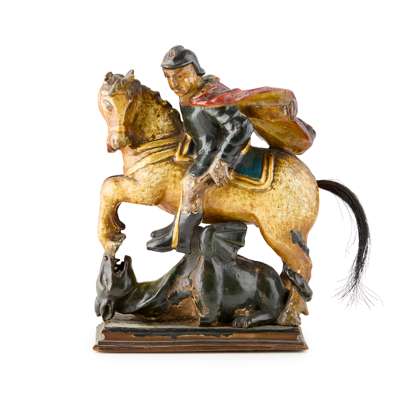 CARVED POLYCHROME FIGURE OF ST GEORGE AND THE DRAGON