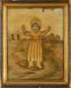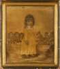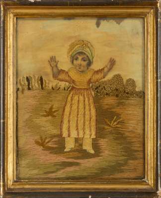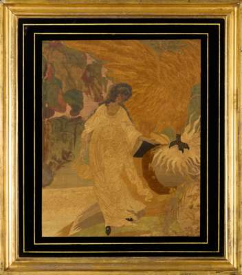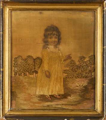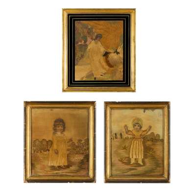 one depicting a maiden carrying a ewer, a massive bird swooping alongside her, within a black and gilt fabric mount and a moulded giltwood frame; the other two a pair worked in wool, depicting young girls in landscapes, within moulded giltwood frames (3)