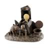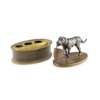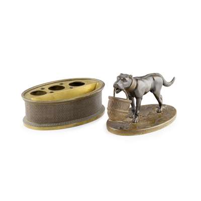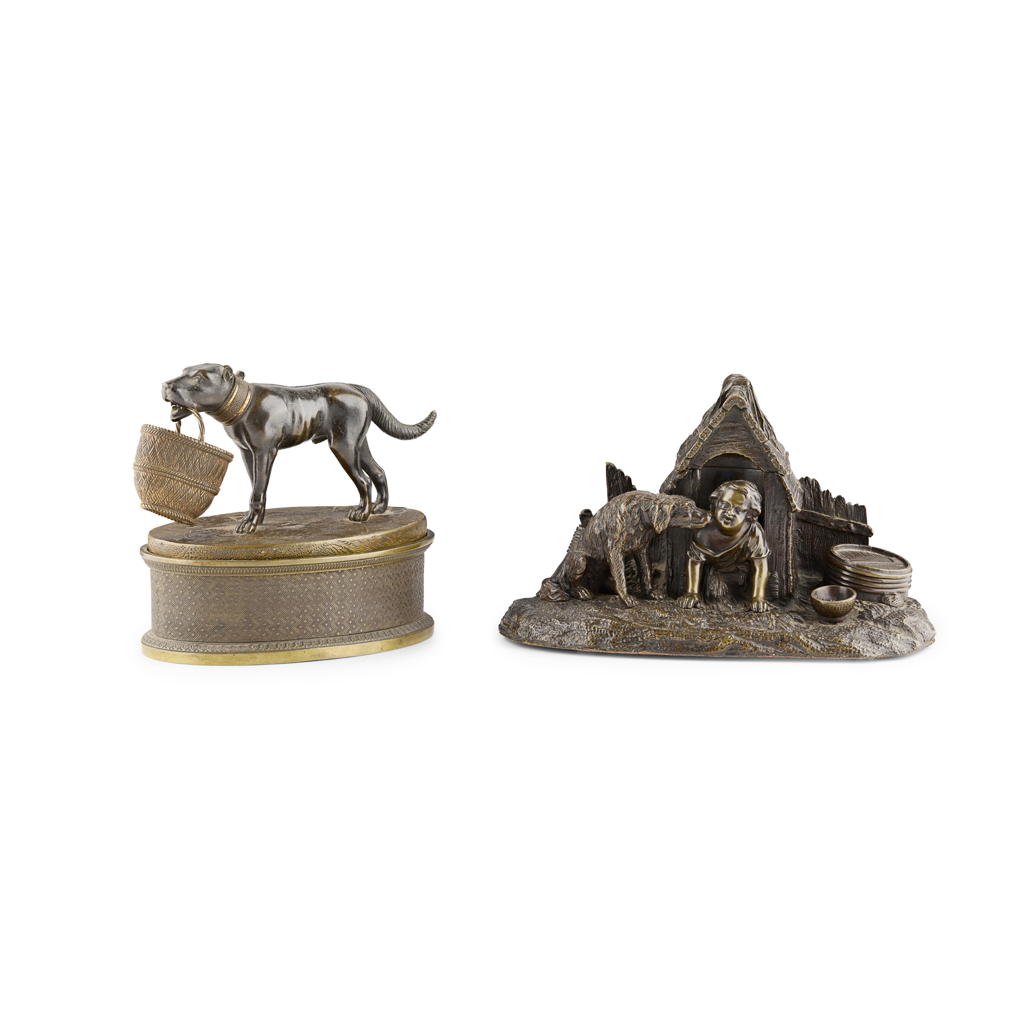one of oval form with a dog carrying a basket, opening to an interior with ink wells and pen holders (liners lacking); the other with a child in a doghouse with a dog licking his face, opening to a square glass inkwell with a silvered metal hinged cover; to one side a coopered barrel with a hinged cover, and to the other side a broom with an aperture for a pen (2)