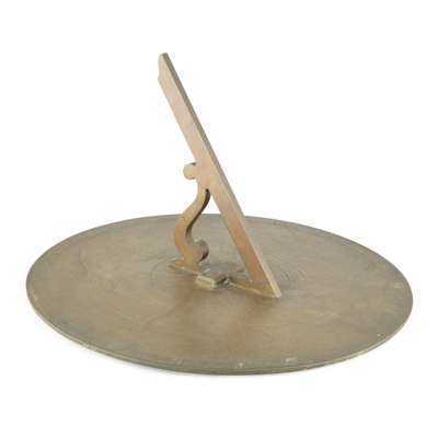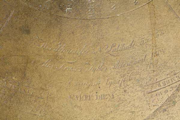 the 15 inch sundial plate engraved with central compass rose, calendrical equation of time, hours marked with Roman numerals and divided by markers, pierced scrolling gnomon, engraved 'Woodhouselee, N. Latitude 55.558, Alexander Fraser Tytler, delivered 1805', engraving rubbed throughout