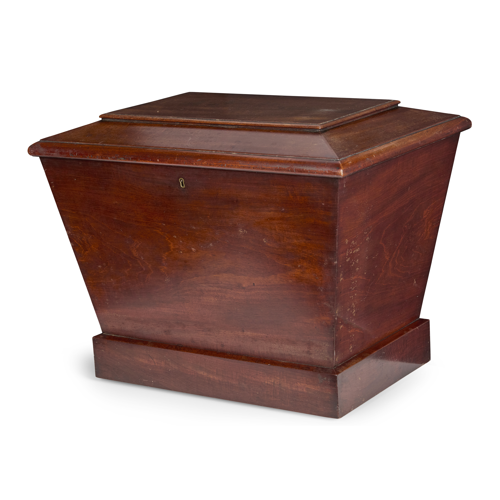 of plain sarcophagus form, the hinged lid opening to a lead-lined divided interior, on brass castors