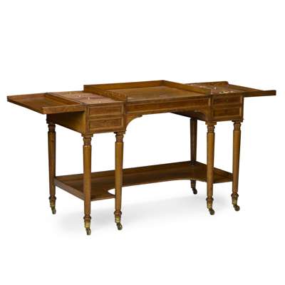 the top with a dropped centre section above a frieze drawer, flanked by hinged tops opening to compartmented interiors, one side with dummy drawers the other with a dummy and one real short drawer, raised on lobed and tapered legs joined by a galleried undertier with a concave front, and ending on brass caps and castors