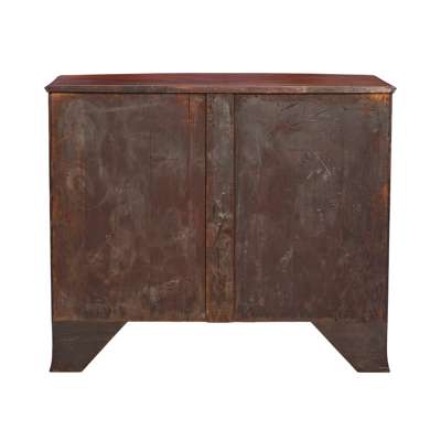 the bowfront top with a moulded edge above a brushing slide and three long deep drawers, raised on French bracket feet