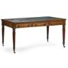the rounded rectangular top with a green leather gilt-tooled insert writing surface, above three short frieze drawers with dummy drawers on the reverse, raised on turned and tapered reeded legs ending in brass caps and castors, the interior of the centre drawer stamped ‘101 WARDOUR STREET/ SOHO LONDON’