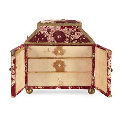 the caddy top with a hinged cover opening to a silk lined cushioned interior, above hinged doors enclosing three silk lined drawers, raised on gilt metal bun feet, paper retailer's sticker for ‘E. DREYFOUS. 104 MOUNT STREET LONDON’