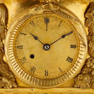 the engine turned gilt dial with Roman numerals, signed ‘Arnold, & Dent, London, No.524’ with a subsidiary ‘Slow/Fast’ dial issuing from the XII numeral, the finely cast and chased architectural case surmounted by two large figures of Time (Chronos) and Victory (Nike) supported by acanthus scroll corbels, the dial within a bezel of a snake biting its tail, the moulded stepped base with acanthus scroll bracket feet centred by a sunburst mask, the single train chain fusee timepiece movement with signed and numbered backplate