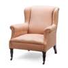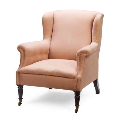the padded back with shallow wings above a cushion seat flanked by studded scrolled arms, raised on tapering fluted forelegs ending in brass castors, the rear leg stamped ‘GILLOWS’; covered in salmon woven fabric