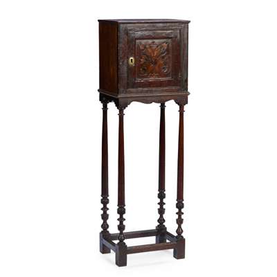 the moulded cornice above a moulded panel door with a floral marquetry, opening to a single shelf, raised on long slender tapering turned legs united by four stretchers