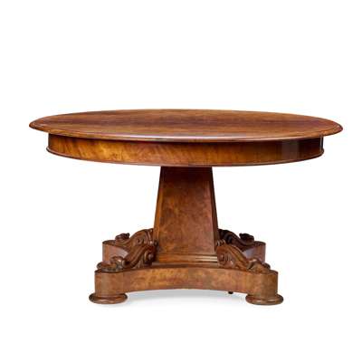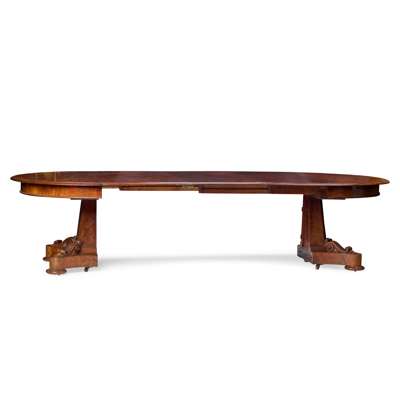 WILLIAM IV PLUM PUDDING MAHOGANY EXTENDING PEDESTAL DINING TABLE