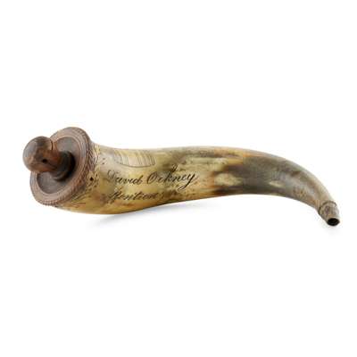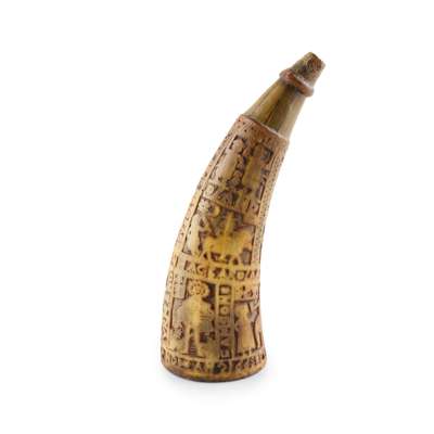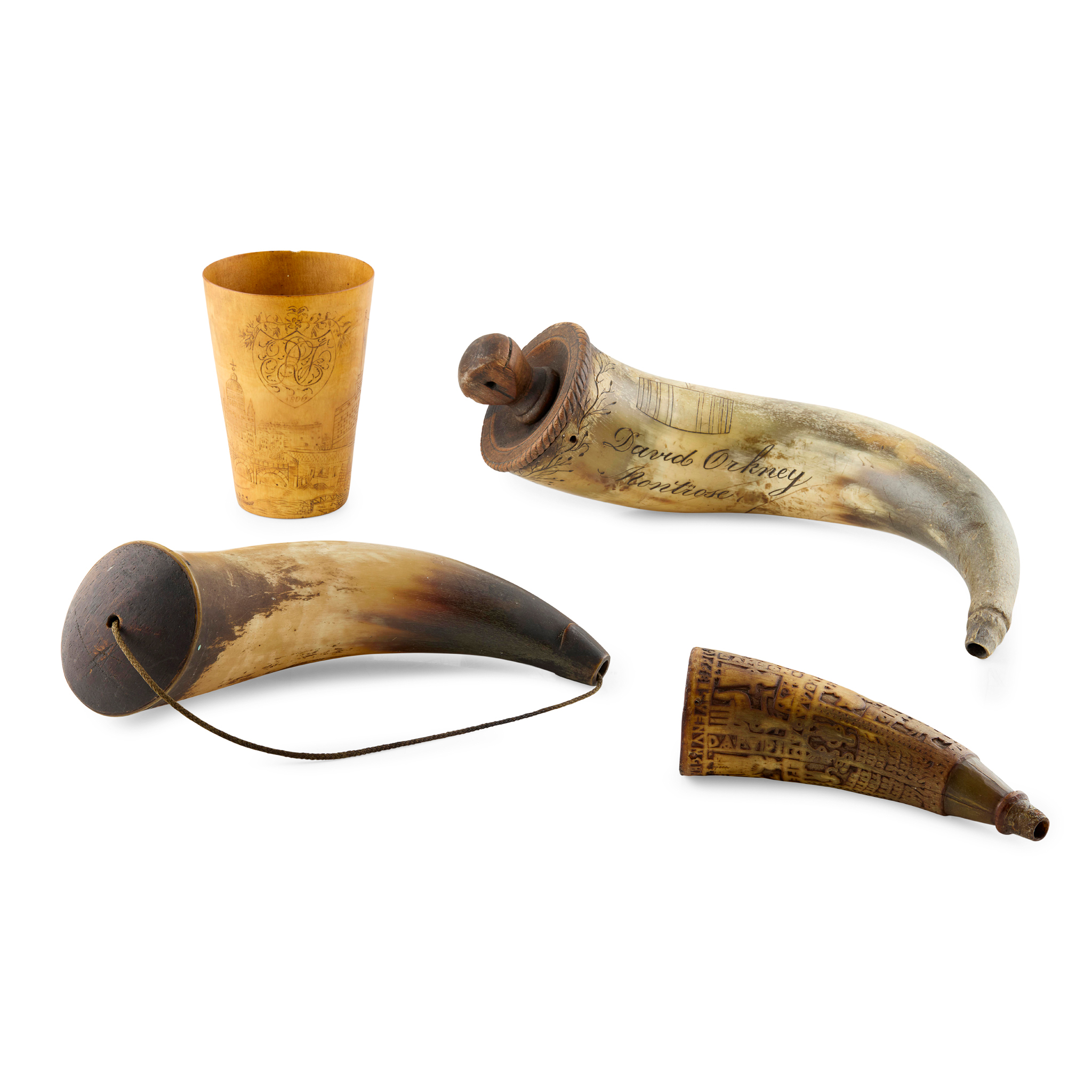 to include a Scandinavian natural horn beaker engraved with figurative panels divided with bands of carved letters, 14.6cm high; a Scottish powder horn inscribed ‘David Orkney, Montrose’, with a wooden mount and stopper, 30cm long; a plain Scottish power horn with a wooden stopper and string, 20cm long; and a beaker engraved with an architectural scene including a castle, a church and a bridge, with the monogram ‘S J’ within a cartouche and dated 1806 (4)