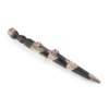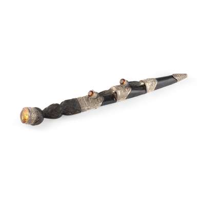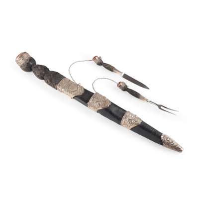 the carved wooden handle with thistle decorated collet mount to pommel enclosing a faceted paste, the leather covered scabbard with embossed thistle mounts set with en suite bi knife and fork
