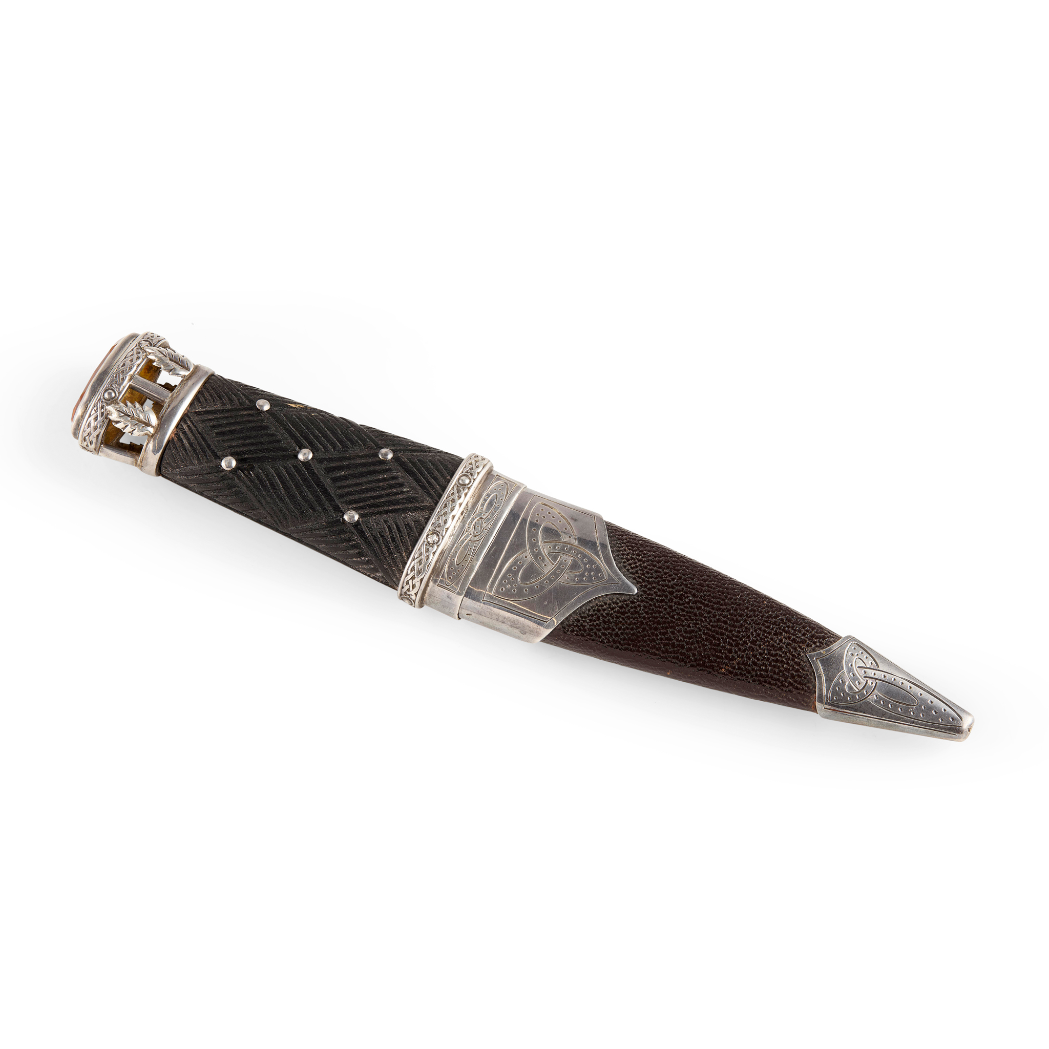 unmarked, the flared handle with basket weave decoration, the pommel with oak leaf and Celtic interlace gallery enclosing a facetted quarts, the lower section with cast and engraved mounts, the leather scabbard with simple knot work decoration