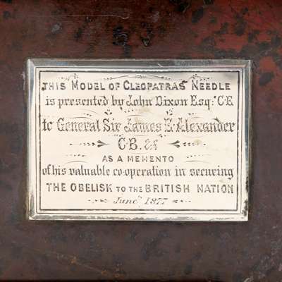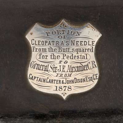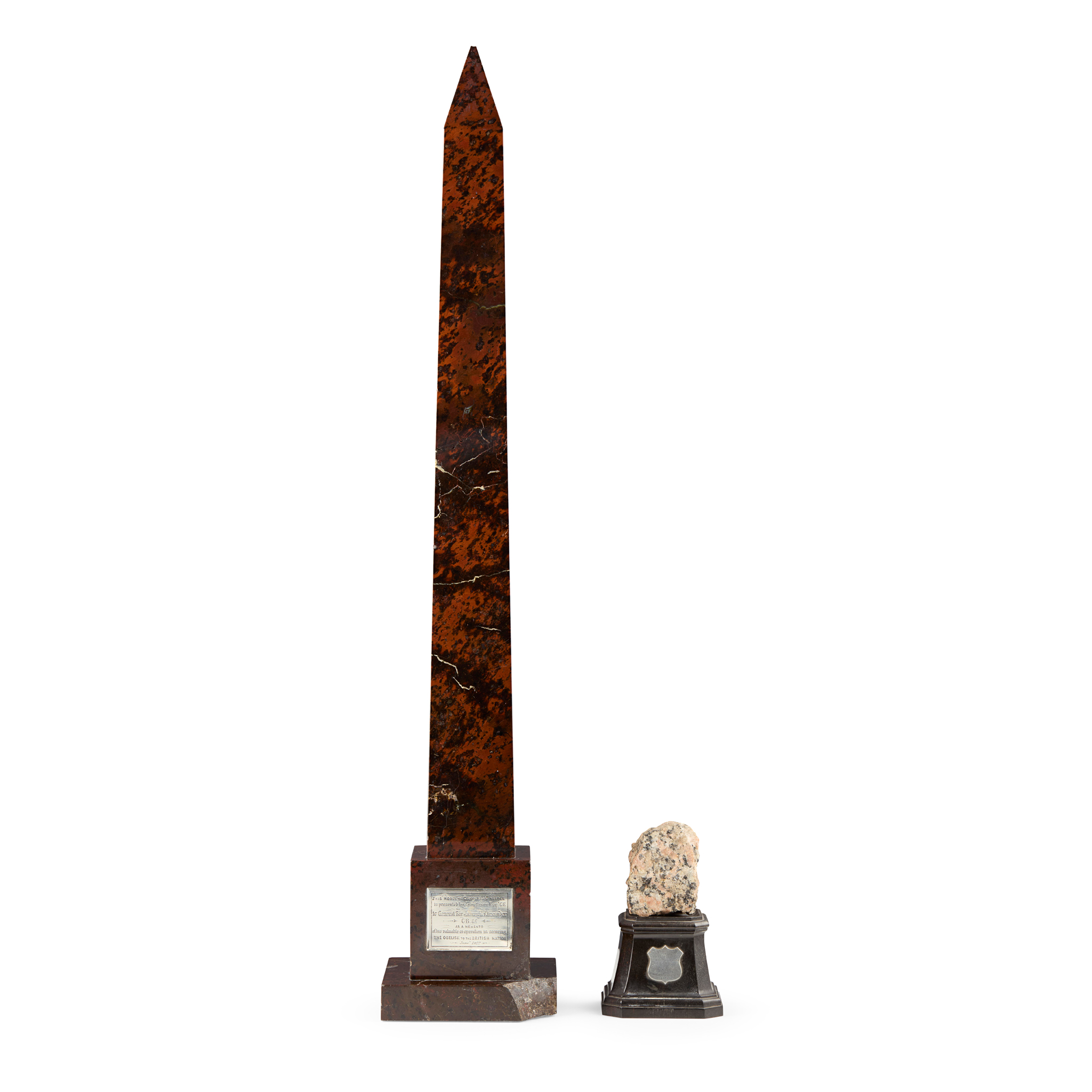mounted with a white metal plaque inscribed ‘This model of Cleopatra’s needle / is presented by John Dixon Esq CE / to General Sir James B Alexander CB & c / as a memento of / his valuable co-operation in securing / The obelisk to the British nation / June 1877'; together with a GRANITE FRAGMENT FROM CLEOPATRA'S NEEDLE, mounted on a tapered ebony plinth base applied with a white metal cartouche inscribed ‘Portion of Cleopatra’s needle / from the butt, square / for the pedestal / to General Sir J. E Alexander CB. ‘ from / Captain Carter & John Dixon Esq CE / 1878’