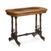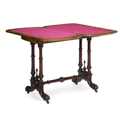 VICTORIAN WALNUT, AMBOYNA, AND BOXWOOD INLAID GAMES TABLE