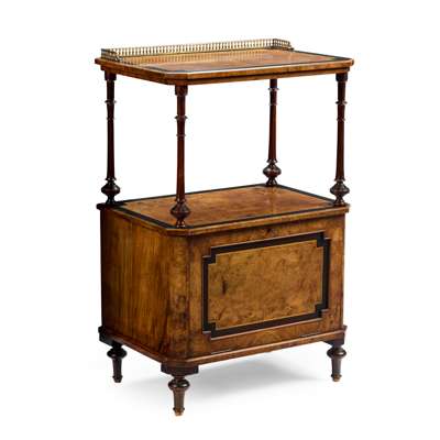 VICTORIAN BURR WALNUT, MAHOGANY, EBONY, AND SYCAMORE INLAID ETAGERE